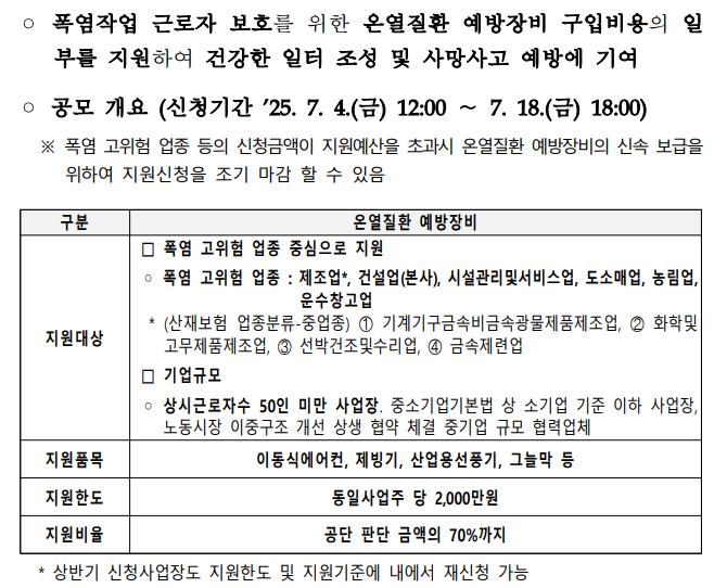 고용노동부와 안전보건공단에서 폭염 및 온열 환경에 노출되는 근로자의 건강을 보호하기 위한 예방설비를 지원하는
